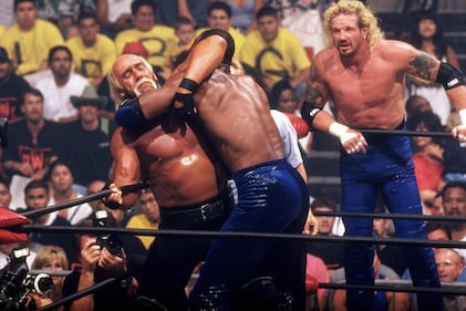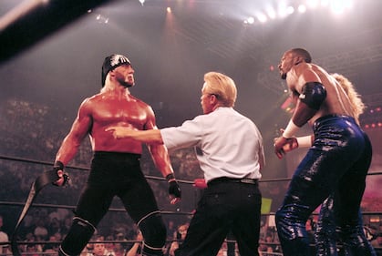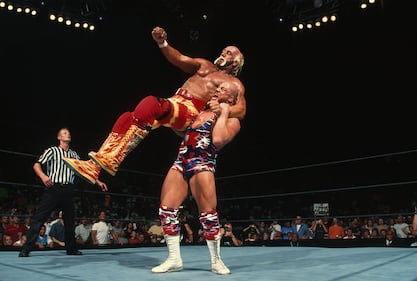 Hulk Hogan in action vs Utah Jazz basketball player Karl Malone at Cox Arena, San Diego, CA on July 12, 1998 (Photo by John W. McDonough /Sports Illustrated via Getty Images)
