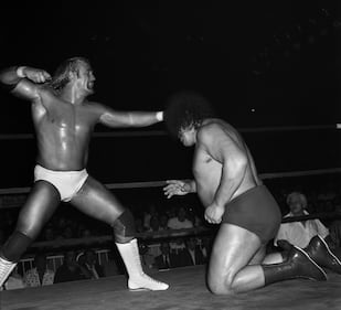 Hulk Hogan delivering a punch to the head of Andre the Giant during their match in Montreal, Canada on August 25, 1980. (Photo by The Stanley Weston Archive / Getty Images)