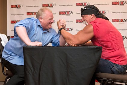 Toronto City Mayor Rob Ford takes on Hulk Hogan in an arm-wrestling match to promote Fan Expo in Toronto on Friday August 23, 2013. (The Canadian Press/Chris Young) (Chris Young/The Canadian Press)