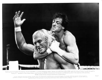 Actor Sylvester Stallone and actor Hulk Hogan on set of the MGM/United Artist movie "Rocky III" in 1982. (Photo by Michael Ochs Archives/Getty Images)