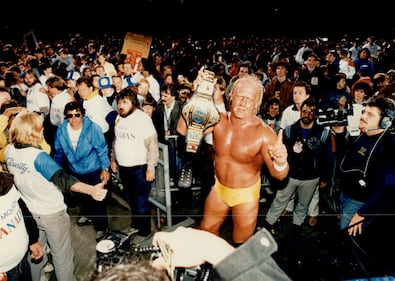 Hulk Hogan makes his entrance during WrestleMania 6 at the SkyDome on April 1, 1990 in Toronto, Ontario. (Photo by WWE/WWE via Getty Images)