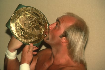 Hulk Hogan celebrates winning the WWF Heavyweight Championship backstage on January 23, 1984 at Madison Square Garden in New York, New York. (Photo by WWE/WWE via Getty Images)