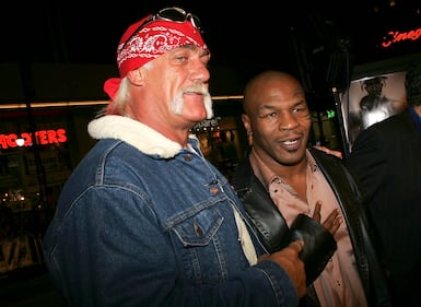 Hulk Hogan and boxer Mike Tyson arrive at the premiere Of "Get Rich or Die Tryin'" on November 2, 2005 in Hollywood, California. (Photo by Kevin Winter/Getty Images)