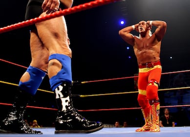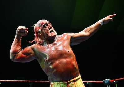 Hulk Hogan makes his entrance during a match while working for the WWE. (Photo by WWE/WWE via Getty Images)