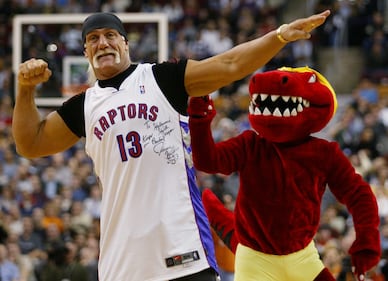 Wrestler Hulk Hogan flexes as he jokes with the Toronto Raptors mascot during a break in the play against the Miami Heat during NBA play in Toronto Friday December 20, 2002. (CP PHOTO/Kevin Frayer)