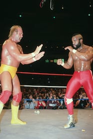 Hulk Hogan and Mr. T in the ring during WrestleMania I on March 31, 1985 at Madison Square Garden in New York, New York. (Photo by WWE/WWE via Getty Images)